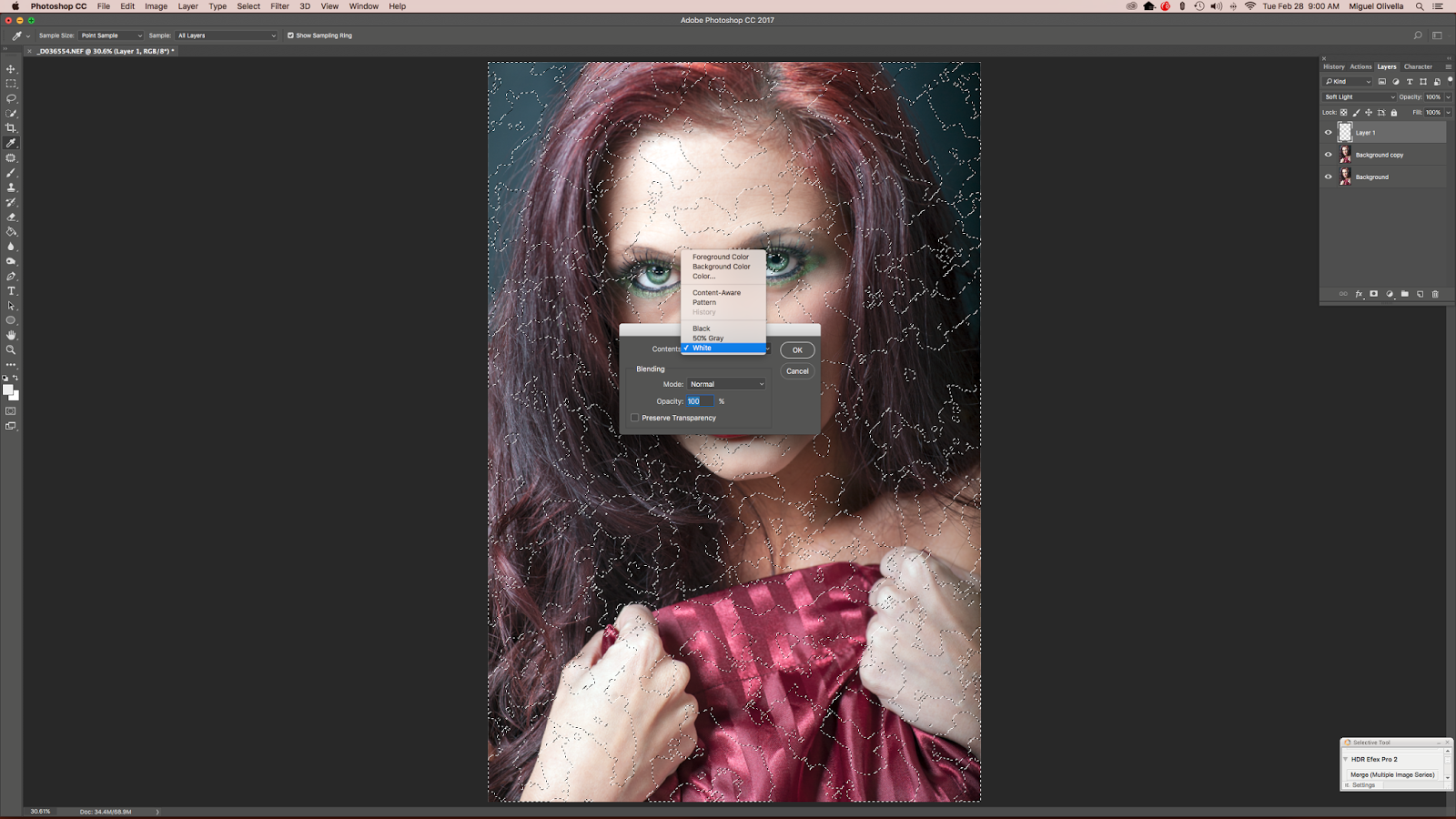Step 7 - Go up to the top and open the Edit drop down menu. Click on "Fill" and then select "white" as your color. This will fill the areas delineated by the marching ants with white, but blended in a soft manner since your layer is set to "Soft Light" blend mode.